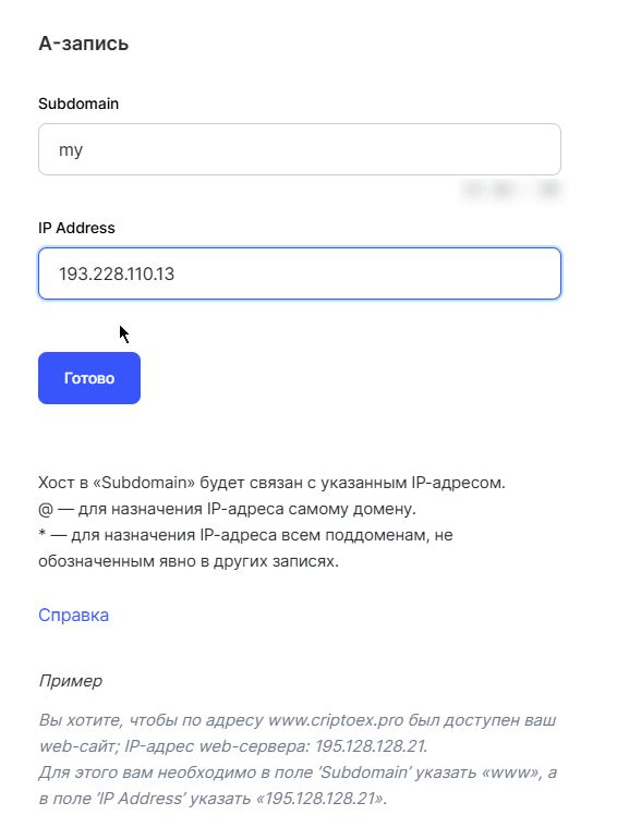 Добавляем A запись с указанием ip адреса промежуточного сервреа, через который будет проходить трафик и перенаправляться на основной.