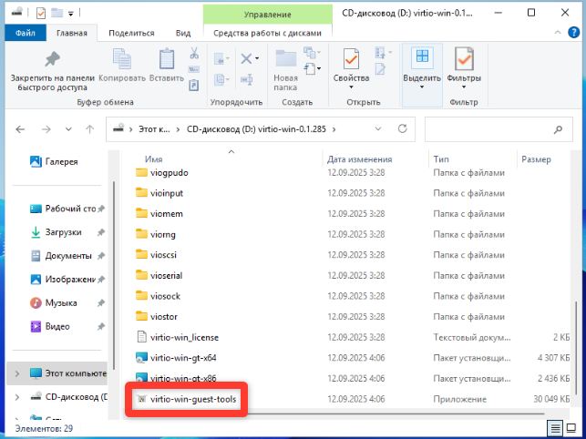 В корне смонтированного образа находим файл с дистрибутивом VirtIO нужной вам разрядности и запускаем его.