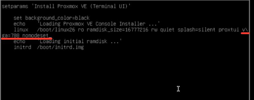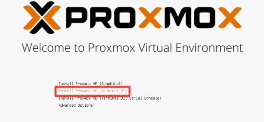 После загрузки с носителя PVE (нажав F11 во время загрузки для временного выбора загрузочного носителя и загрузившись с USB) выберите опцию "Terminal UI" (пока не подтверждайте ее)