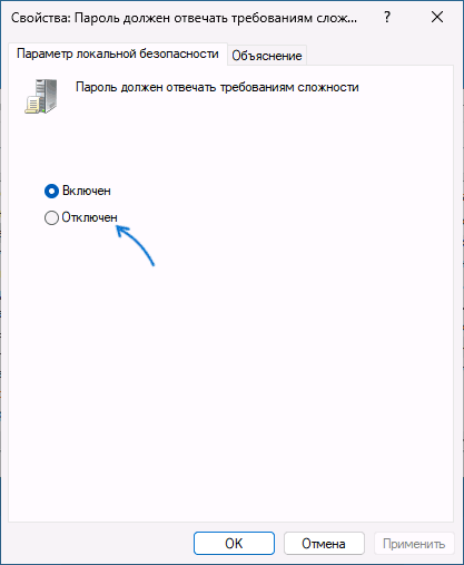 Если вы видите, что настроена минимальная длина пароля (значение отличается от 0) или включена политика «Пароль должен отвечать требованиям сложности», дважды нажмите по такой политике и измените значение на 0 или «Отключен» соответственно.